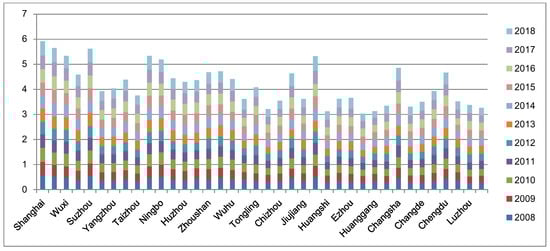 Finally, according to Formulas (13)–(15), the evaluation results of UWIS of 38 cities from 2008 to 2018 are obtained by calculating the Euclidean distance and between each city and the positive and negative ideal alternative, and by computing the relative closeness , as shown in Table 2, Figure 3.