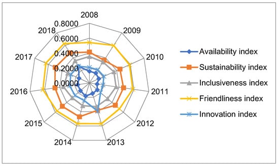 From the perspective of each subsystem (as shown in Figure 4), among the five major development indexes, the average comprehensive development level from 2008 to 2018 in descending order is as follows: friendliness index (0.5855) > sustainability index (0.4470) > inclusiveness index (0.3366) > innovation index (0.2462) > availability index (0.1599).