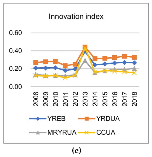 The innovation index witnessed a fluctuating upward trend, reaching its peak in 2013 (see Figure 5e). It ranks fourth among the five major development indexes, staying at a lower level. The innovation index of the cities in the YRDUA is significantly higher than the average level of the YREB, while the MRYRUA’s and CCUA’s innovation indexes are relatively close, generally lower than the average level of the YREB. Only in 2013 was the innovation index of the CCUA above the average level and close to that of the YRDUA.
