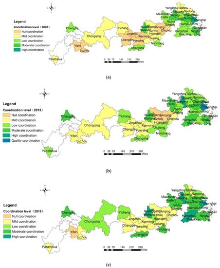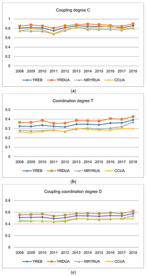 In order to further describe the temporal–spatial characteristics of the coupling coordination of the UWIS system in the Yangtze River Economic Belt, the coupling degree, coordination degree, and the coupling coordination degree of 38 cities from 2008 to 2018 are calculated according to Formulas (16)–(18), as shown in the Table 4.
