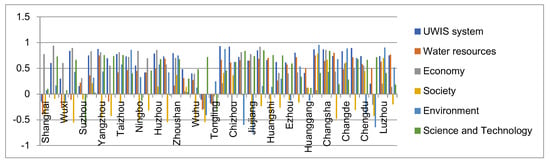 Within the three major urban agglomerations in the Yangtze River Economic Belt, the top 10 cities in UWIS are Shanghai, Nanjing, Wuxi, Suzhou, Hangzhou, Ningbo, Wuhan, Changsha, Nanchang and Hefei. Among them, six cities belong to the Yangtze River Delta urban agglomeration, and four belong to the middle reaches of Yangtze River urban agglomeration. The bottom 10 cities in UWIS are Anqing, Chizhou, Huangshi, Jingzhou, Huanggang, Xianning, Yueyang, Panzhihua, Luzhou and Yibin. Of them, two cities belong to the YRDUA, accounting for 9.5% in this area, five belong to the MRYRUA, accounting for 41.7% in this area and three belong to the CCUA, accounting for 60% in this area. Therefore, we ranked the three major urban agglomerations in terms of UWIS as follows: YRDUA, MRYRUA and CCUA. The UWIS of the primary and secondary central cities is significantly better than that of the regional central cities and general cities. This is mainly due to the fact that the primary and secondary central cities are located in the lower coastal areas of the YREB. In those areas, the vigorous governance of water resources and environment and a high level of economic development and urbanization all provide a driving force for UWIS in the YREB.