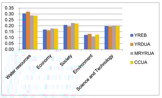 In Formula (18), is the comprehensive evaluation value reflecting the development level of the UWIS system; is the coupling coordination degree; are the weights of the criterion level, and . By inviting experts, scholars and managers from water resources planning and management departments in the field of water resources, we use the expert scoring method to obtain , respectively.