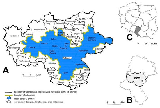 Research area: (A) Cities that function as separate districts in the Górnośląsko-Zagłębiowska Metropolis (GZM). (B) GZM against the background of the Silesian Province. (C) Silesian Province against the background of Poland. Source: Authors’ own elaboration.