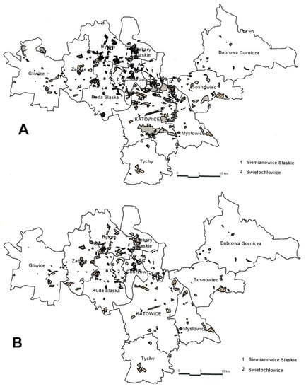 Brownfields in the Górnośląsko-Zagłębiowska Metropolis. (A) At the turn of the 21st century, and (B) in 2018. Source: authors’ own elaboration on the basis of opitpp.orsip.pl.