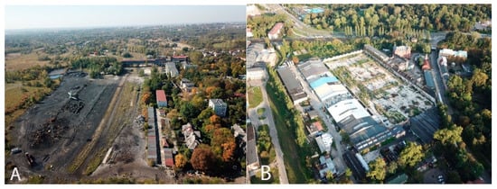 Examples of brownfields in the Górnośląsko-Zagłębiowska Metropolis. (A) Coal Mine Kazimierz Juliusz; (B) Textile Works in Sosnowiec. Source: Own aerial photos made by the drone.