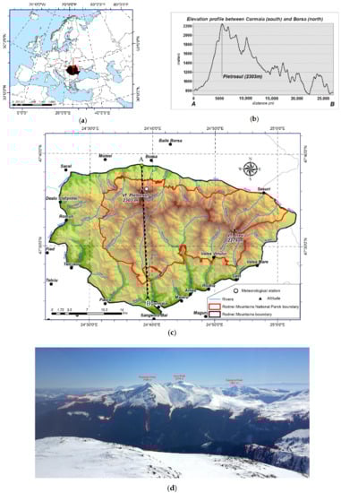 Rodna Mountains National Park and Biosphere Reserve is part of Rodna Mountains, with the limits located on the following coordinates: in the west 47°37′36.819″ N/24°35′4.133″ E, in the north 47°37′34.262″ N/24°35′7.955″ E, in the east 47°33′50.73″ N/25°1′48.422″ E, and in the south 47°25′50.675″ N/24°38′30.394″ E. Rodna Mountains National Park has an area of 472.07 km2 and a maximum elevation of 2303 m a.s.l. (Figure 1a–c).