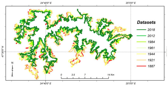 Timberline elevational variability was reconstructed by marking its successive positions on the 5 sets of maps (1887, 1921, 1944, 1961 and 1984) and two sets of aerial images (2012, 2018). The reconstructed dynamics in the 1887–2018 period is different for the two slopes of the massif, with a higher temporal and spatial variability on the southern slopes (Figure 2).