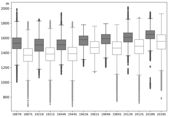 Boxplot representation of timberline elevation on the northern and southern slopes of Rodna Mts during 1887–2018 (gray color—northern slope, white color—southern slope).