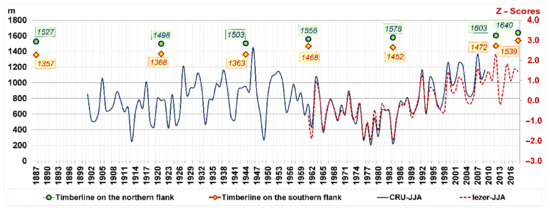 Comparing summer temperature variability with upper timberline dynamics between 1887 and 2018 and also taking into account that forest response to temperature variability has a time lag of approx. 10 years (but may be subject to other controlling factors at the same time) [8], we note that timberline dynamics generally followed temperature trends on both slopes of the massif (Figure 4). This may be reflective of the influence of summer temperature variability on timberline elevational position. However, during the period 1947–1976 which appears slightly colder, timberline ascent may have been influenced by other factors. We suggest that longer periods with increased summer temperature (e.g. 40–50 years such as 1977 to present) had a larger influence on timberline upward shift, while shorter cool periods (e.g., 30 years or less, such as between 1887–1910 and 1947–1976) likely contributed less to timberline dynamics. This is likely due to other climatic elements (high humidity, cloudiness and precipitation) and/or reduction in anthropogenic activities which may have favored timberline upslope shift. Our analysis therefore shows that longer intervals with summer temperature above the average had a greater influence on timberline rise compared to shorter intervals with summer temperature below the average.