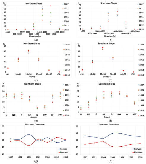 For slope curvature, it can be observed that timberline position was mostly distributed on concave areas on the northern slope, and on convex areas on the southern slope (Figure 5g,h). However, there is a higher variability in this distribution on the northern slope, with timberline predominantly located on convex areas in 1944 and 1984 (Figure 5g). Over the recent years (2012 and 2018), a trend of increasing proportion of timberline distribution on concave surfaces can be observed on both slopes (Figure 5g,h).
