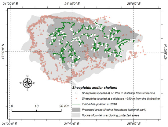 The dynamics of the total number of sheep and cattle in the same localities was also analyzed for the 1990–2003 period, based on the resources provided by the National Institute of Statistics [69]. The data were transformed into relative values (%). On the northern slope, between 1990 and 2003 there was a decrease in livestock numbers by 29.8% in sheep and by 12.5% in cattle. In comparison, on the southern slope the livestock decrease was more pronounced (42% in sheep and 34.6% in cattle) [69]. In 1990, there were more than 89,000 sheep and cattle in the localities adjacent to the Rodna Mts, whilst in 2003 their number was approx. 33% lower, of around 61,000. As shown before, agricultural changes were more ample on the southern slope, and the forest was more affected by anthropogenic activities. The 1990–2003 dataset also shows uncommon situations, such as the decrease in livestock on the southern slope, coincident with an increase in agricultural land, pastures and meadows; this may also be explained by structural agricultural changes unrelated to timberline position. Therefore, to assess the potential impact of pastoral activity on timberline dynamics, we performed a detailed cartographic analysis based on the high-resolution aerial photographs from 2018. We thus identified 1829 sheepfolds and cattle stables in Rodna Mts that were still functional in 2018. Of these, 183 sheepfolds and shelters were located at ± 250 m distance above and/or below the timberline (Figure 6). These data show the presence of pastoral activity in the vicinity of timberline, despite statistical data [69] showing a reduction in livestock number in the area over the recent two decades.