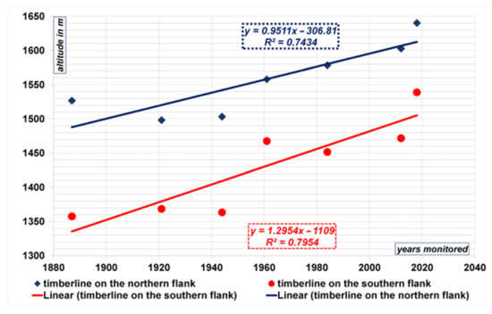 Statistical analysis of the data derived from cartographic resources showed that in 2018 timberline position was on average 1640 ± 2 m on the northern slope and 1539 ± 2 m on the southern slope. For the entire 1887 to 2018 time interval, timberline increased on average with 113 ± 2 m on the northern slope (at an average rate of 0.8 m yr−1) and with 116 ± 2 m on the southern slope (at an average rate of 1.3 m yr−1), respectively (Figure 3). For the northern slope, the maximum elevational position reached by timberline was 2017 m in 2012, and the minimum position 921 m in 2018. For the southern slope, the maximum elevational position reached by timberline was 1929 m in 2018, and the minimum 678 m in 1887 (Figure 3). The difference in average timberline position on the two slopes decreased progressively from 170 m in 1887 to 101 m in 2018 (Figure 3).