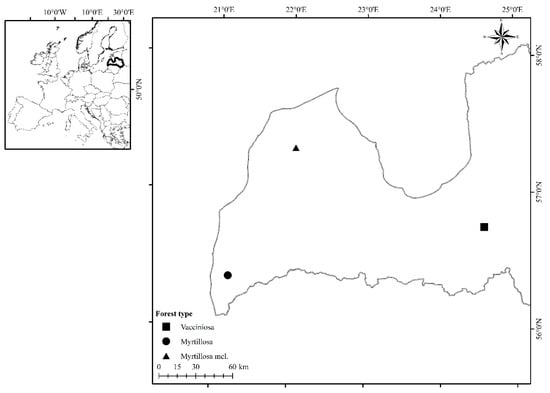 Study areas were located in Scots pine stands in western and central part of Latvia: Vacciniosa forest type with dry nutrient-poor acidic sandy soil (56°45′ N, 24°35′ E), Myrtillosa forest type with nutrient-poor podzolic sandy soil (57°19′ N, 22°03′ E), and Myrtillosa mel. forest type with drained peaty soils (56°22′ N, 21°12′ E; Figure 1). Climatic conditions are similar in all sites: mean monthly temperature ranging from −1.2 °C to −6.1 °C in January and 16 °C to 19.4 °C in July, the mean annual precipitation is 725 mm, and vegetation period ~202 days [].