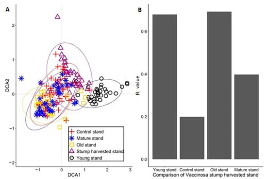 The detrended correspondence analysis (DCA) ordination results in a study area of Vaccinosa with ANOSIM results. (A) DCA analysis of how Vacciniosa forest type plots overlap. (B) Similar stands are compared to stump harvested stand.