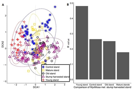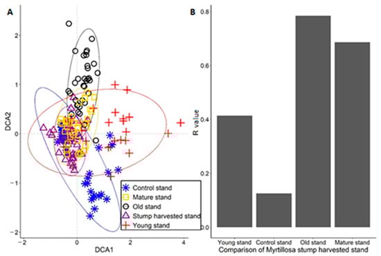 The DCA ordination results in a study area of Myrtillosa mel. with ANOSIM results. (A) DCA analysis of how Myrtillosa mel. forest type plots overlap. (B) Similar stands are compared to the stump harvested stand.