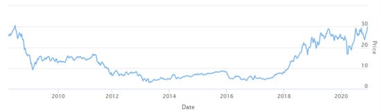 Price of emission allowances. (ECX EUA Future, Continuous Contract (Front Month) settlement price. Graph retrieved from https://ember-climate.org/data/carbon-price-viewer/ (accessed on 13 December 2020) with raw data from ICE https://www.quandl.com/data/CHRIS/ICE_C1-ECX-EUA-Futures-Continuous-Contract-1-C1-Front-Month (accessed on 13 December 2020)).