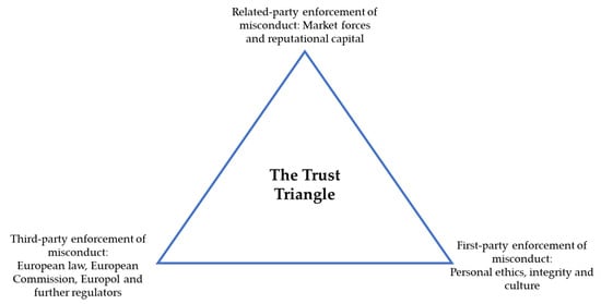 Theoretical models on the behavior of criminal economic agents can be helpful to explain under what conditions the conduction of a crime becomes less likely. For instance, Karpoff [16] makes an ex-ante prediction of the different effects of technology change on frauds in the financial markets. Based on the theoretical model of Klein and Leffler [65], Karpoff [16] explains how single elements of digitalization affect the financial sector and expects a net decline in misconduct for the long-term trend due to lower information, search, and transaction costs. In the Klein and Leffler [65] model’s optimality condition, a firm decides not to cheat if the real interest rate is sufficiently small and the price elasticity of a high-quality good (corresponding to an honest market behavior) is relatively high. A decrease in both information costs and transaction costs tends to increase the price elasticity of high-quality goods in financial markets, as trusted firms can raise capital more easily [16]. Interestingly, Chen [66] claims that the digital economy reduces market frictions due to reduced search, entry, transaction, and reproduction costs. Karpoff [16] observes that this condition relates to the related party enforcement of the Trust Triangle (Figure 2). In a more general form, the Becker model [67] illustrates that an individuum conducts crime when the expected benefits exceed the expected costs. We argue that the implementation of a DLT solution in emissions trading has two effects. First, due to the indirect impact through lower transaction costs and the increase in price elasticity, the probability of fraudulent attacks will decrease [16]. Second, the barriers for some types of fraud will increase, and therefore, the costs of financial misconduct in emissions trading rise.