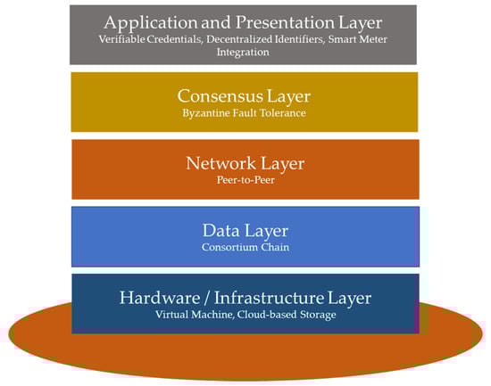 Figure 3 illustrates the classical five-layer DLT structure [72,73] we are using. The hardware layer comprises the virtualization, where the decentralized distribution of the nodes is the core element. Each computer or terminator is called a node in a DLT network. Transactions and values in a DLT will never be overwritten, which is the key difference compared to a traditional database. If an incorrect message is generated, all the nodes in the system would be notified. Both the incorrect message and its correction will be stored with traceability in the ledger and are shared among multiple nodes. Some nodes contain the full state of the ledger, while other nodes only contain part of the ledger. It allows a DLT network to provide transparency and optimal efficiency across the nodes. The distributed nature of DLT also enables the ease of scaling in a DLT network. By increasing the number of nodes, a suspected fraudulent actor’s ability to influence the consensus protocol used by the DLT is reduced, thus increasing the resistance to such attacks. The realization seems favorable in a cloud-based system in order to reduce the maintenance hassle.