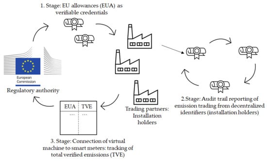 The first stage in Figure 4 describes the issuing process of emission allowances by the European Commission at the beginning of the trading period via auctioning or allocation free of charge. In the second stage, each installation holder and trading participant will receive a DID for secure identification. In addition, each installation holder has a unique identity wallet, which contains the holder’s information, emission credit balance, and the auditable transaction history, which provides traceability and supports the verification of traded emission certificates. The records of transactions of such a decentralized system, the so-called “audit trail”, are anticipated to be secure, trusted, and tamper-proof [34,75].