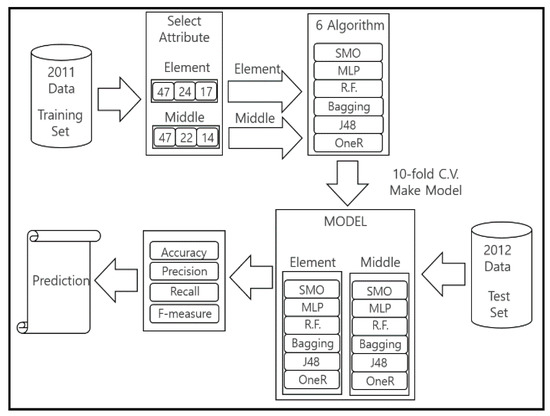 Regarding the data-mining techniques, six algorithms were selected by comparing and analyzing their performance accuracies and capabilities based on previous studies. The OneR algorithm is a simple classification rule that is typically applied to a dataset to test a particular attribute. It is a simple and accurate classification algorithm that can create one rule for each predictor and select the rule having the smallest number of errors [25]. The J48 algorithm determines classification criteria based on normalized entropy difference and uses the concept of information entropy to create a DT from the learning data [26]. Bagging is used for statistical classification and regression, and it is an ensemble meta-algorithm designed to improve safety and accuracy. It can reduce the distribution of unstable procedures, such as regression trees, while greatly improving predictive accuracy [27]. Random forest is an ensemble learning method used for the creation, classification, and regression operations of multiple decision trees during training cycles. The benefits of random forest are that it selects one optimal solution, but it randomly selects from the k best options, thereby improving the decision trees [28]. The MLP is a kind of feed-forward artificial NN comprising at least three node hierarchies in which each node, except the input node, is a neuron that uses a nonlinear activation function [6]. The SMO algorithm is sensitive to fine-tuning, but manual fine-tuning is not desirable because it does not guarantee the efficiency of results [13].