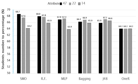 The highest SMO algorithm prediction results were 67.3% when using 47 attributes, and the lowest SMO algorithm prediction results were 65.0% when using 24 attributes for the 2012 elementary-school dataset. Therefore, the difference between the two cases was 2.3%. For the 2012 middle-school dataset, the highest and lowest prediction results for the SMO algorithms differed by approximately 4.5%, with accuracy scores of 68.7% for 47 attributes and 64.2% for 14 attributes.
