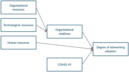 To carry on the analysis, we extended the model of determinants of telework adoption developed in [13,18] by introducing the notion of organizational readiness of firms, which represents a mediator between teleworking adoption rate and firm’s resources and capabilities, and by including “COVID-19 restrictions factor” as an additional determinant of teleworking adoption rate. We empirically tested our model with the help of path analysis.