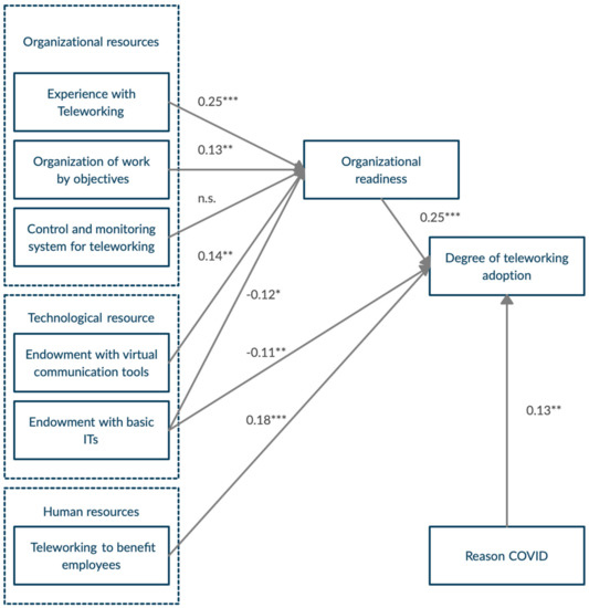 Previous experience with telework has demonstrated organizational readiness for telework adoption, as shown by the positive and significant coefficient on the corresponding path, providing confirmation for Hypothesis 1. Companies that already had experience with telework have developed systems and procedures as well as technological resources on which they could rely during the crisis.