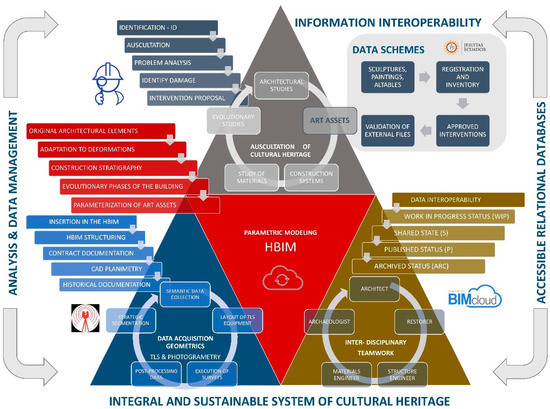 Workflows in CH lack clarity in processes and information dissemination, and tools are rendered obsolete by heritage institutions [6]. Geometric data for the three-dimensional reconstruction should contain important information in management and physical information processes [23]. To join both processes, a new paradigm in the documentation of sites and monuments emerges, a digital platform based on BIM and applied to heritage. The works dealing with the methods and tools to manage information to diagnose and monitor buildings suggest a high semantic level of the original documents [24]. To solve semantic data management, Bruno et al. [24] proposed the use of both BIMcloud services and a BIM repository to reduce the size of deliverables.