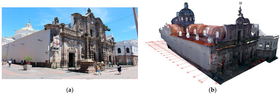 (a) Photograph of the exterior of the Church of the Company of Jesus; (b) view of the point cloud included in the HBIM project using the ArchiCAD software.