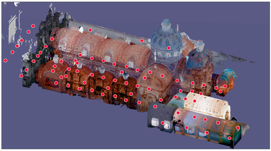 The TLS scanning process was carried out through several campaigns. Captures were taking in both the exterior and the interior to acquire the complete geometry of the Church of the Company of Jesus; a coupling and alignment of the range cloud were used by effective and accurate procedures, as the recording report of Cyclone REGISTER 360 shows. The TLS technique compiles space data precisely [38,39]. Surveys were conducted at five levels (Table 1) to cover most of the surface of the church. The five levels were as follows: in a platform, in the stem of the arches, in the chorus stand, in the upper balcony next to the chorus and in the corridor of the lantern under the dome.
