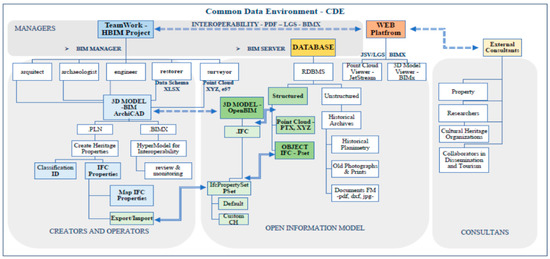 The information and data interchange of an active project, based on the BIM methodology, should be managed in a structured and safe way. For this purpose, a CDE should be used to meet, manage and divide each container of information through an established procedure (EN-ISO 19650-1). Studies are increasingly focused on presenting the benefits of implementing a CDE in construction projects, although CH sustainability has not been applied yet [48,49,50,51]. The client should provide an open common digital space (within the same work platform) to which all the members of the team could access to share the information of the collaborative project. In this regard, the Foundation of the Church of the Company of Jesus delegated the CDE to the researchers from both the University of Seville and the UIDE. A server was available to store all the information of the TeamWork-HBIM project, based on the ArchiCAD® platform, to be managed by the whole technical team to review or modify according to their role.