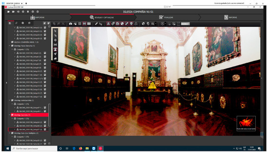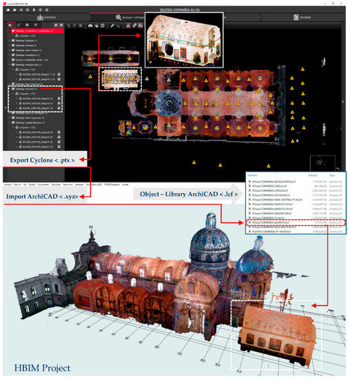 The interconnection of the TeamWork active methodology began by registering technical teams, engineers, architects and constructors in a Virtual Private Network (VPN). The information basis of the working field was made through a technical information system of the Equatorial CH. The characteristics of the movable asset and immovable assets, such as altarpieces, sculptures, paintings and silverware objects, were recorded in this information system. For the initial information interchange, software that allow operators to be connected were proved. TeamWork is an interoperability system of BIM operators. Each BIM operator worked through a working role (e.g., architect-manager, modelling technician, or installation technician), and they accessed the editable parts with permission. The operation permission was given by the main manager who was responsible for structuring the HBIM project, so the functions of the operation were limited by this person. On the other hand, the dataset obtained by the remote sensing techniques was managed with appropriate software interoperating with TeamWork. For this purpose, after processing the range cloud with Cyclone Register 360, the Leica JetStream software was used as a tool to visualise the scanned model. Equally to FARO Cloudshare, Leica JetStream Viewer facilitated the interchange of data processed with Cyclone LGS, so external agents could explore the point clouds without requiring a use licence [52]. This viewer, with no antecedents, could be installed by each technical team to visualise and surf original data stored in an equipment in real time. The .jsv or .lgs files could be shared from a JetStream Enterprise server with an O-licence from Cyclone or Cyclone REGISTER 360 + PUBLISHER.