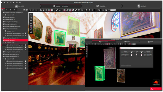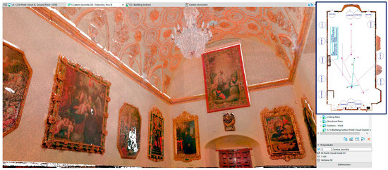 Large amounts of information from the TLS surveys were managed, so two methods could be analysed and applied to identify artistic and historical assets: the segmentation of point clouds in strategic sectors as a classification methodology of the pieces, and a second method that related the data subset to a parametric object (based on the Geometric Descriptive Language (GDL) programming). The vestry was chosen as the most representative space of the church. This room contains many baroque elements and a varied set of artistic works. First, the point cloud was segmented in areas to delimit the scanned paintings. This procedure was effective outside the HBIM digital platform, and point cloud management software, such as Cloudcompare or Cyclone Register 360 from Leica, was required for implementation. It must be taken into account that the point cloud needs to provide an adequate resolution for monitoring. The Leica BLK360 scanner, with Waveform Digitizing (WFD) technology, has three HDR digital cameras, a colour sensor and fixed focal length (Image 2592 × 1944 pixels) and one Infrared thermal camera (Image 160 × 120 pixels), with four integrated within the team. Although the laser system of the equipment reaches a precision of range 4 mm to 10 m, the “High density” mode, used in all surveys, provides a resolution of 5 mm @ 10m (distance is not exceeded). Therefore, techniques such as the Structure from Motion/Multiview-Stereo (SfM/MVS) could be more appropriate because other inherent properties of the MDC system were available. However, the TLS system gives us 360 panoramas (full dome of 30 images, 150 Mpx, 360° × 300°), very suitable to be explored from the JetStream application, allowing three Image options—colour, HDR and IR (Figure 9). In this regard, all the paintings in the vestry were identified with limit boxes (Box limit from Cyclone). These boxes could be managed and exported to an original format of Leica for analysis (Figure 10), although outside of the BIM environment.
