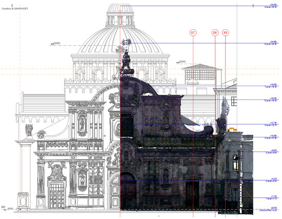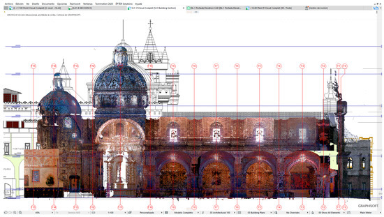 The aforementioned reverse engineering process is intended to be used for the automatic or semiautomatic transformation of three-dimensional point clouds, focused on HBIM [15,16,17,18]. Most semiautomatic processes require complex software, in which many experts participate, because current BIM digital platforms cannot automatically work. Including a dense point cloud of a building in this digital platform is among the difficulties, together with the fact that, even for existing open platforms to manage cloud points for the automatic segmentation, such as the Point Cloud Library (PCL) [19], current BIM software cannot make a semantic segmentation of the morphology of the elements. Except in cases [20,21] where the process is automatic. Reverse engineering in heritage buildings is therefore more and more complex. On the other hand, the BIM modelling process is designed following a constructive logic: it starts with the construction elements from the foundation phase and ends with the roof, installations and auxiliary elements. This process has nothing to do with reverse engineering as the massive data captured from LIDAR technology show both the skin of the building and the elements superficially joined to it. These data are recorded in files with great deal of information that cannot be used in BIM digital platforms. For this reason, new strategies related to the interoperability of accurate modelling systems should be developed [22], and especially those related to data management and new sustainable scenarios. This paper includes the implementation of a TeamWork-HBIM methodology that strengthens reciprocal information flows among all the participating areas of specialist technical teams and operators. The application example is the Conservation Plan of the Church of the Company of Jesus, which is the badge of the Latin American baroque erected by the Jesuit order between 1605 and 1765. This work is the beginning of the interventions programmed for an integrated and sustainable management project of the city’s heritage.