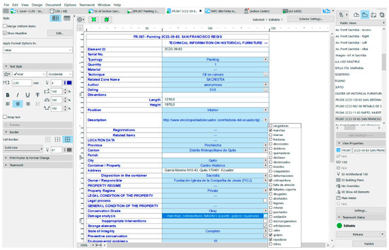 Thus, the TeamWork + CDE platform could be used by the BIM operators to create accurate parametric models that reproduce the artistic assets, based on the range cloud included in the HBIM project. As a general inventory sheet of the vestry, a scheme was configured with all the properties of the Heritage Furniture category by following the model of the NHI sheet. All the information compiled was linked to a rich database that is continuously updated (Figure 15).
