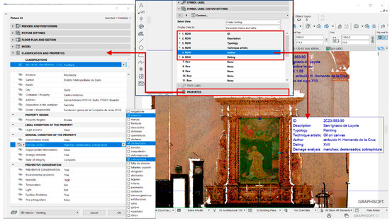 These characteristics are related to the conservation and maintenance of the works of art, including marks, loosening, rips, deformations and overpainting. After recording the artistic assets of the vestry, specific labels were created with the specific data for a rapid graphic identification of the objects within the HBIM project. The properties of these labels could be modified by accessing the pre-established options in the Classification and Properties section of the Picture object. Thus, the state of vulnerability, the heritage assessment, the characteristics and values of the work of art established by the specialist were shown (Figure 12).