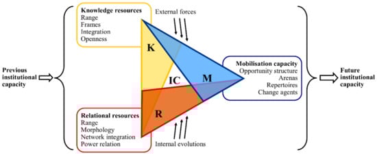 Conceptualisation of the development of institutional capacity. Based on Healey et al. [16], Healey et al. [13] and Healey [23]. Abbreviations: IC (Institutional Capacity), K (knowledge resources), R (Relational resources), M (Mobilisation capacity).