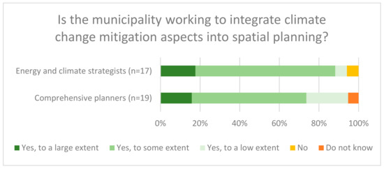 In terms of the internal co-operation in municipal strategic planning processes between the target groups of the surveys, about half of the energy and climate strategists participate actively in the comprehensive planning processes, as presented in Figure A2 in Appendix D. This is still a higher proportion relative to the active participation of comprehensive planners in the energy and climate strategic process, which was reported by less than one-third of the respondents (Figure A3 in Appendix D).