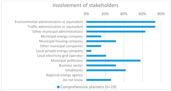 Figure 4 shows that the relevant municipal administrations have a high level of involvement in comprehensive planning processes. The same figure illustrates that municipal politicians often participate as well, but not as frequently as the other municipal administrations. Moreover, the local energy company and the local electricity grid operator participated in only about a fifth of the comprehensive planning processes (Figure 4).