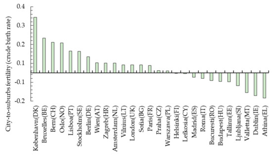 A further elaboration focused on the differential fertility of suburbs and central cities in the European capitals (Figure 4). Paralleling the results that are presented above, the crude birth rates were higher in central cities than in suburbs (positive values of the indicator) in the capital cities of Western, Northern, and Central Europe, with the only exception of Lisbon and Vilnius, although the fertility gap between suburbs and central cities was rather moderate (less than 0.2 births per 1000 inhabitants) in these two agglomerations. Copenhagen, Bruxelles, Bern, and Oslo showed the highest city-to-suburbs differentials in crude birth rates. Capital cities in Southern Europe (Rome, Madrid, and Athens) displayed higher suburban fertility, while Lefkosia occupied a more mixed position. Eastern European capital cities, on average, showed similar demographic dynamics (suburban fertility higher than urban fertility). Interestingly, Dublin, the capital city of Ireland, showed a fertility pattern that was similar to South-Eastern cities. Despite being classified as an ‘Atlantic’ country, recent socioeconomic dynamics in Ireland often resembled those that were observed in more peripheral and economically disadvantaged countries of Eastern and Southern Europe. Moreover, the 2007 crisis intensively impacted this country, similarly to what was observed, e.g., in Greece, Spain, Portugal, or Italy.