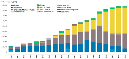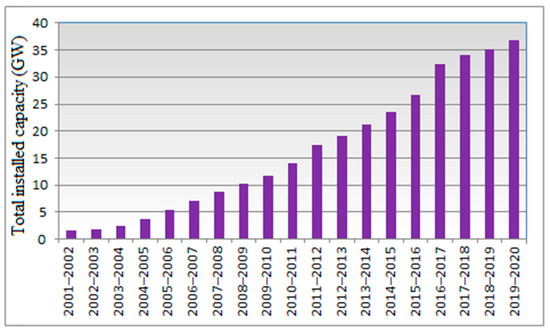 India is one of the leading countries in the world to stack a higher ratio of RER in its energy mix and records greater growth of WES since 2001 (Figure 3) [9]. The Indian Energy Agency (public organization) has aimed to achieve 60 GW of power generation through WES by 2022 from their total RER capacity of 175 GW [10]. At present, onshore wind energy capacity contributes about 37.69 GW as of March 2020 [11]. Though the onshore WES accelerates commendably, India struggles to raise the wind energy capacity both offshore and nearshore. However, some of the Indian states hold higher potential and the MNRE announced a clear roadmap to attain an offshore wind energy capacity of 5 GW targeting the year 2032 [12].