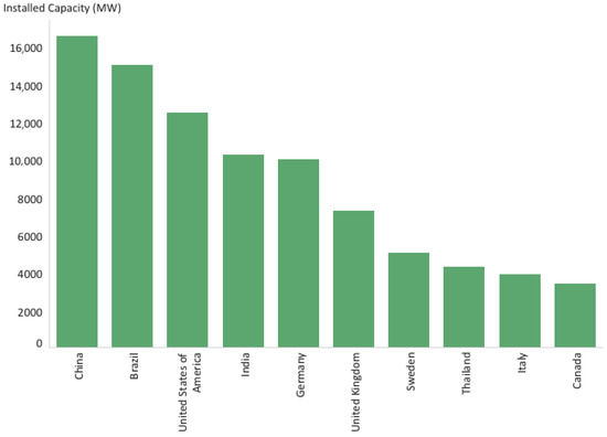 For a few decades, the evolution of renewable energy resource (RER) additions on the global energy mix has shown a significant rise, notably from the year 2001. Among the available installed capacity of RER, solar photovoltaic (SPV) and wind energy show greater dominance in their global renewable energy mix markedly from the year 2010, as demonstrated in Figure 1. At present, the potential for renewable energy production from WES is estimated between 630,720 and 1,489,200 TWh/year globally [8]. Due to the abundant availability of wind energy resources, some of the countries, namely China, Brazil, the United States of America, and India, attained a higher magnitude of installed capacity, as illustrated in Figure 2.