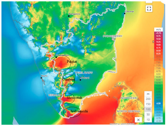 Potential locations of wind passes in Tamilnadu (Global Wind Atlas—January 2021).