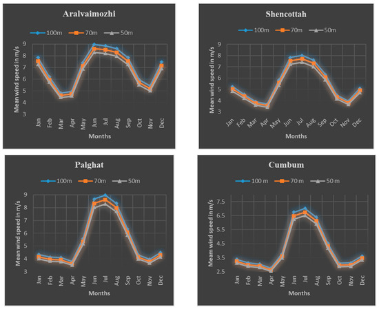 The historical time-series datasets were investigated from the Weibull distribution function using wind navigator in the Windographer software. The potential wind sites were identified through the Global Wind Atlas map as described above. Using Windographer [35], the MEERA data were taken for all the four locations, i.e., Aralvaimozhi, Shencottah, Palghat, and Cumbum. From the analysis, the frequency and hours per year of the wind speed, yearly speed variation, the variation of scale and shape factor, dominant wind direction as per the wind rose diagram were calculated. Further, the annual mean wind speeds of the four passes observed at various heights, such as 100 m, 70 m, and 50 m, are illustrated in Figure 6. It was observed that the mean wind speed of Aralvaimozhi, Shencottah, and Palghat exceeded 8 m/s except for the Cumbum Pass that attained a maximum wind of 7 m/s; notably, the Aralvaimozhi Pass had a good rate of wind speed throughout the year, particularly from January to March and April to September. Although the wind speed variations were observed between different heights of the hub, but not greater range. Considering these inferences, all four passes have a greater potential for wind energy conversion.