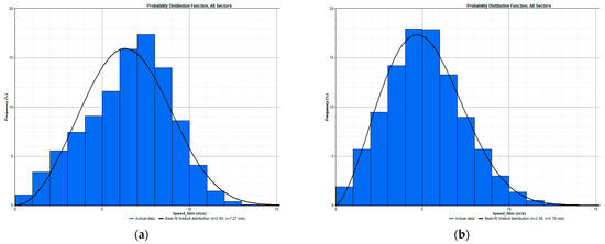 The average speed () and standard deviation (σ) of the wind is computed from Weibull parameters of the probability distribution function using Equation (5) and Equation (6), respectively [40]: