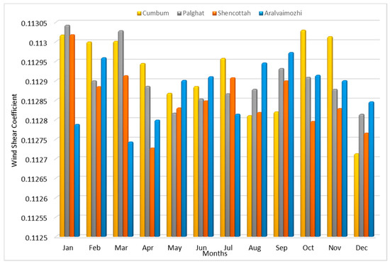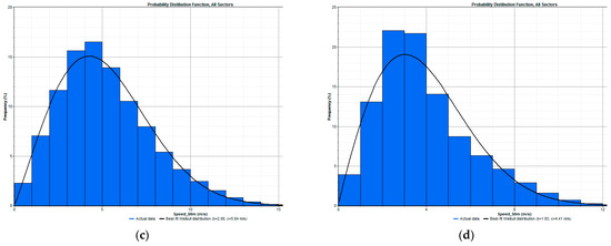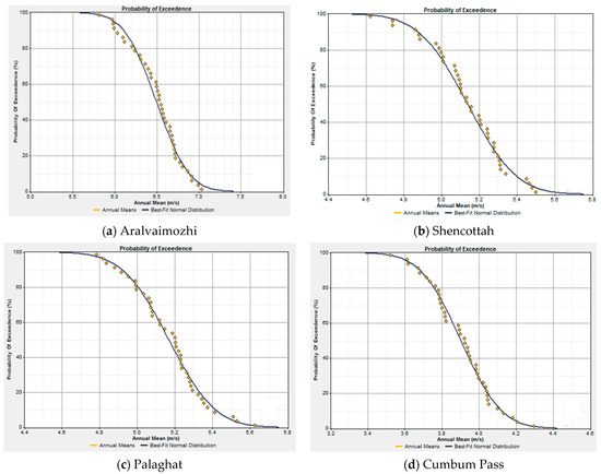 After estimating the distribution pattern of the wind speed, it was easy to investigate the potential along with the economic feasibility of a specified site. The output power of the wind turbine is a function of variable wind speed and is calculated based on the average wind speed or by analyzing the measurement of real-time data of frequency distribution of wind speed. The Weibull frequency distribution process is a widely used PDF to examine the characteristics of wind speed and to estimate the power density. The shape factor (k) was used for measuring the shape of the frequency distribution. The wind speed was concentrated and narrowly distributed for higher k values and widely distributed for the low value of k. The shape parameter (k) was large for sites with a constant or low variation of speed. The quality of wind was determined by the scale factor c, and its value was directly proportional to wind speed, i.e., high windy sites had high scale factors, while low wind sites had low scale factors. The PDF was deployed to project the total annual average output power by consolidating the power produced on an hourly basis at any wind speed [44]. Based on these inferences, the wind speed frequency distribution of all four wind passes, i.e., Aralvaimozhi, Shencottah, Palghat, and Cumbum, were analyzed at a hub height of 50 m and illustrated in Figure 7 using the Weibull distribution process.