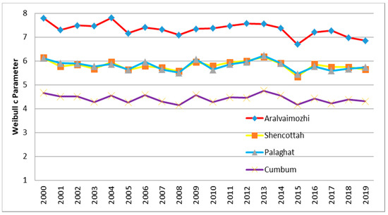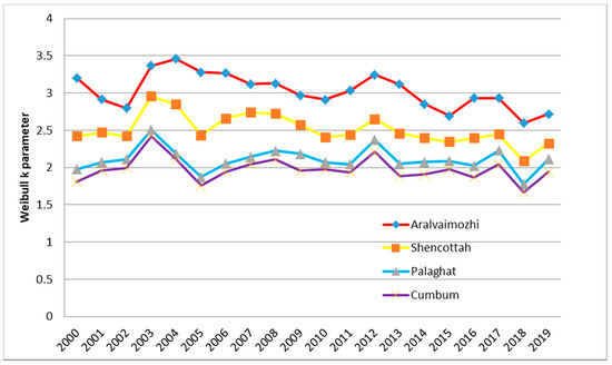 From Figure 8 and Figure 9, it is investigated that the Weibull “k” and “c” factor varied from 2.59 to 3.458 with a mean of 2.995 and 6.70 to 7.809 with a mean of 7.334 for Aralvaimozhi wind pass 2.089 to 2.738 with a mean of 2.478 and 5.348 to 6.172 with a mean of 5.813 for Shencottah pass,1.77 to 2.505 with a mean of 2.085 and 5.453 to 6.225 with a mean of 5.813 for Palghat pass and Cumbum pass 1.671 to 2.424 with a mean of 1.949 and 4.146 to 4.754 with a mean of 4.422, respectively analyzed for 20 years from the period 2000 to 2019. After finding the Weibull parameters “k” and “c”, it was possible to estimate the wind power density that was one of the vital indicators to describe the consistency of wind nature throughout the period (i.e., month, season, or year), which helps in the classification of wind power class in the four passes as depicted in Table 6.