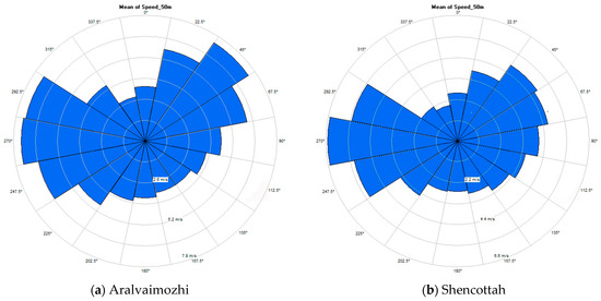 Wind or energy rose analysis provides the optimum placement of a wind turbine to maximize the energy and thereby decrease the wake losses. Before installing the wind turbines, past information of the prevailing wind direction (energy rose) is required that can maximize the energy production annually. Hence, wind direction investigation plays a vital role in the assessment of potential in the wind energy system. The status of the wind direction is if the wind is blowing from the same direction frequently, the rotation of the nacelle to face the wind through the yaw control mechanism is reduced, in turn ultimately reduces the wear and tear of the turbine components. The frequency distribution wind direction is usually represented in a polar form known as a wind rose. The wind rose plots divide each segment of the polar plot in the percentage of the frequency the wind is blowing in the speed range. These plots can be plotted by dividing the wind sample data into a suitable number of sectors (here in this investigation, the number of the sector is taken as 16) and computing the statistical share of each sector. From this analysis, the dominant direction of the wind from which the maximum energy can be explored will be known [45]. The wind rose is a graph depicting the time distribution of the direction and the azimuthal distribution of the wind speed in a specific location. A wind rose displays the anemometer data for sitting analysis, such as direction and wind speed. The distribution of wind speed and the wind direction at a particular location for time obtain graphically from the wind rose diagram. From the analysis, the dominant wind direction at 50 m hub height in the four wind passes is presented in Figure 10a–d. The wind rose diagrams also show the frequency of wind energy harvested from each direction is indicated by the concentric circles to the percentage.