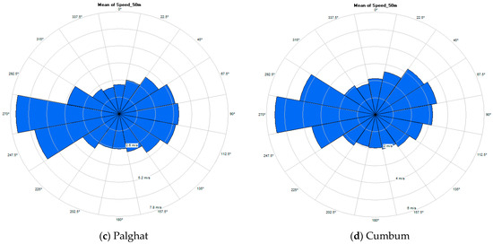 From Figure 10a,b, it was concluded that the dominant wind direction indicated in this diagram were 270° and 45° in Aralvaimozhi and Shencottah wind pass locations. In Figure 10c,d, 270° and 67.5° are the dominant wind directions in Palghat and Cumbum wind passes. The wind rose analysis showed that the frequency of wind in calm conditions was depicted in the center and proved that the northwest direction contribution was more in all the four wind pass locations. It was summarized that most of the wind directions where the wind was the strongest were northwest.