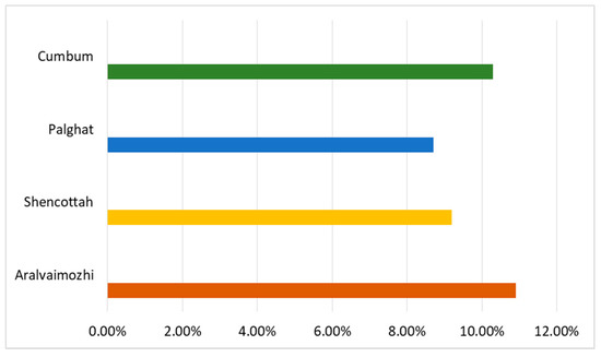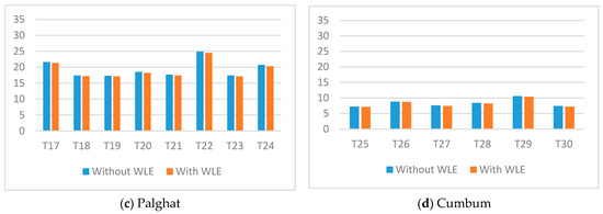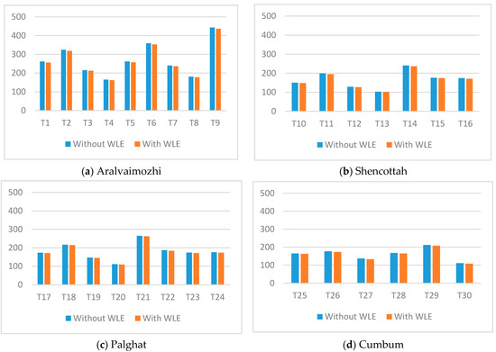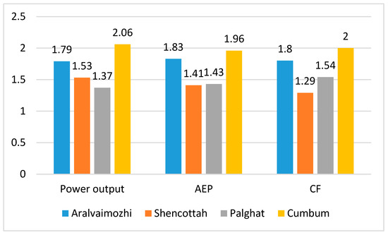 Furthermore, the percentage variations of turbine output, AEP, and CF between both cases (with and without WLE) are shown in Figure 20 to demonstrate the effect of WLE. From the image, it is perceived that the Cumbum pass has a severe influence on WLE because the power output of the wind turbines is reduced up to 2.06%. Similarly, AEP and CF are reduced up to 1.96% and 2.0%, respectively. On other hand, Shencottah and Palghat display less percentage variation due to their reduced WLE.
